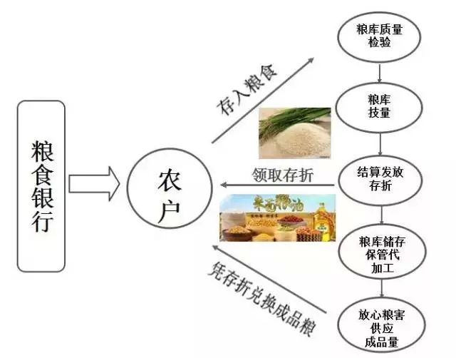 農(nóng)民打下新糧,存入企業(yè)提供的糧倉,定期或活期自由選擇,并且享有利息,這個(gè)糧倉就作為“糧食銀行”為農(nóng)戶提供代存代儲(chǔ)代加工糧食等服務(wù),糧食銀行會(huì)給農(nóng)戶發(fā)放 “糧食存折”,記錄著存糧日期、數(shù)量、取兌日期和余額等信息。農(nóng)戶還可憑存折在鄉(xiāng)村各個(gè)網(wǎng)點(diǎn)兌換米、油或化肥、種子、農(nóng)藥等各種農(nóng)資。農(nóng)戶走進(jìn)糧食銀行,就好像走進(jìn)了商業(yè)銀行的儲(chǔ)蓄所,只不過存取的內(nèi)容從現(xiàn)金變成了糧食。